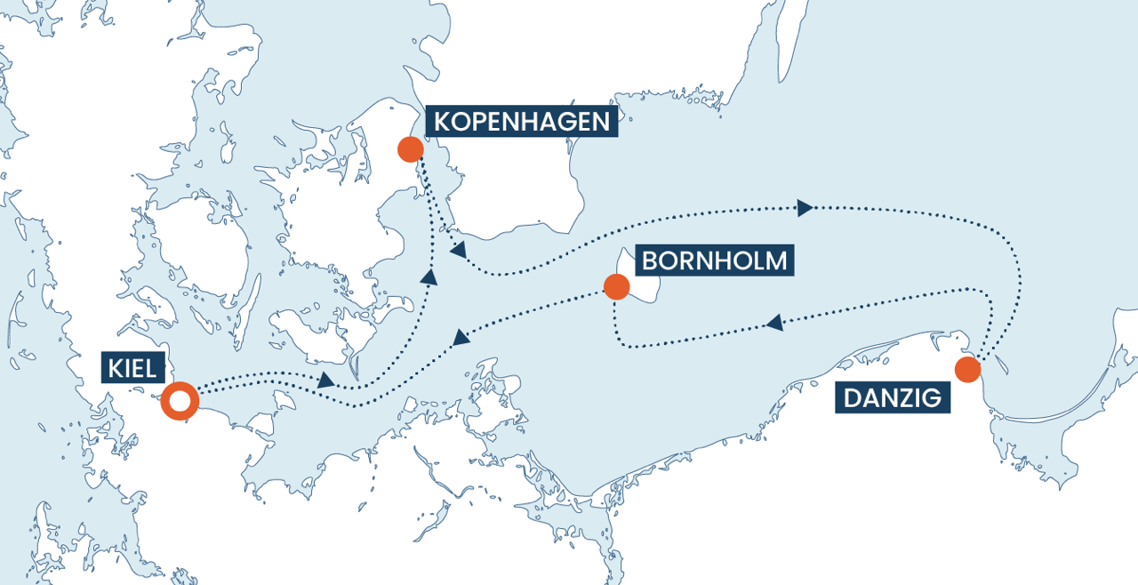 Von Kiel über Dänemark (mit Kopenhagen) und Polen (Danzig) zurück nach Kiel.
